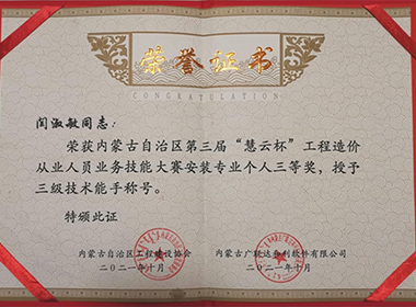 • 我司闫淑敏获得《内蒙古自治区第三届“慧云杯”工程造价从业人员业务技能大赛》个…