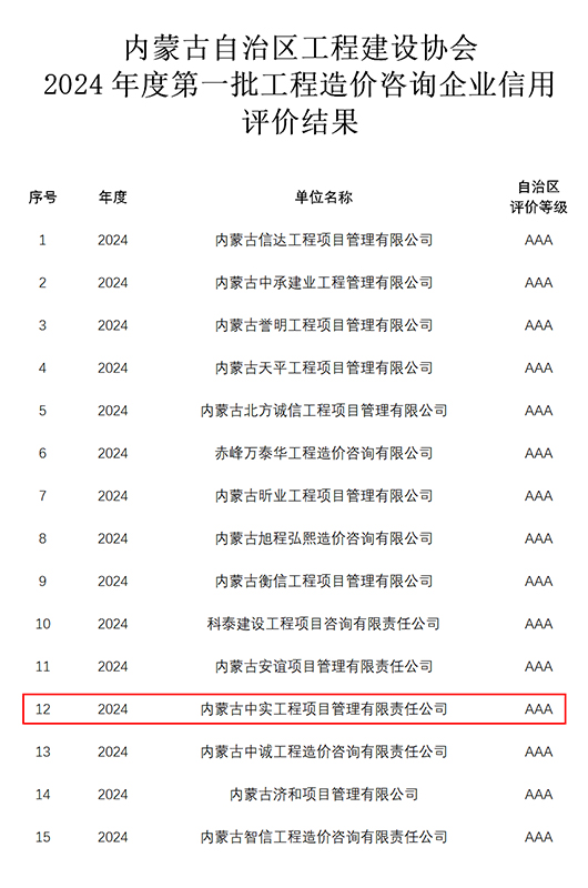 近期,我公司参加内蒙古自治区工程建设协会组织的“2024年度第一批工程造价咨询企业信用”申报,获得“信用AAA级证书”。我公司成立多年以来,遵循中国工程造价管理协会对造价咨询企…